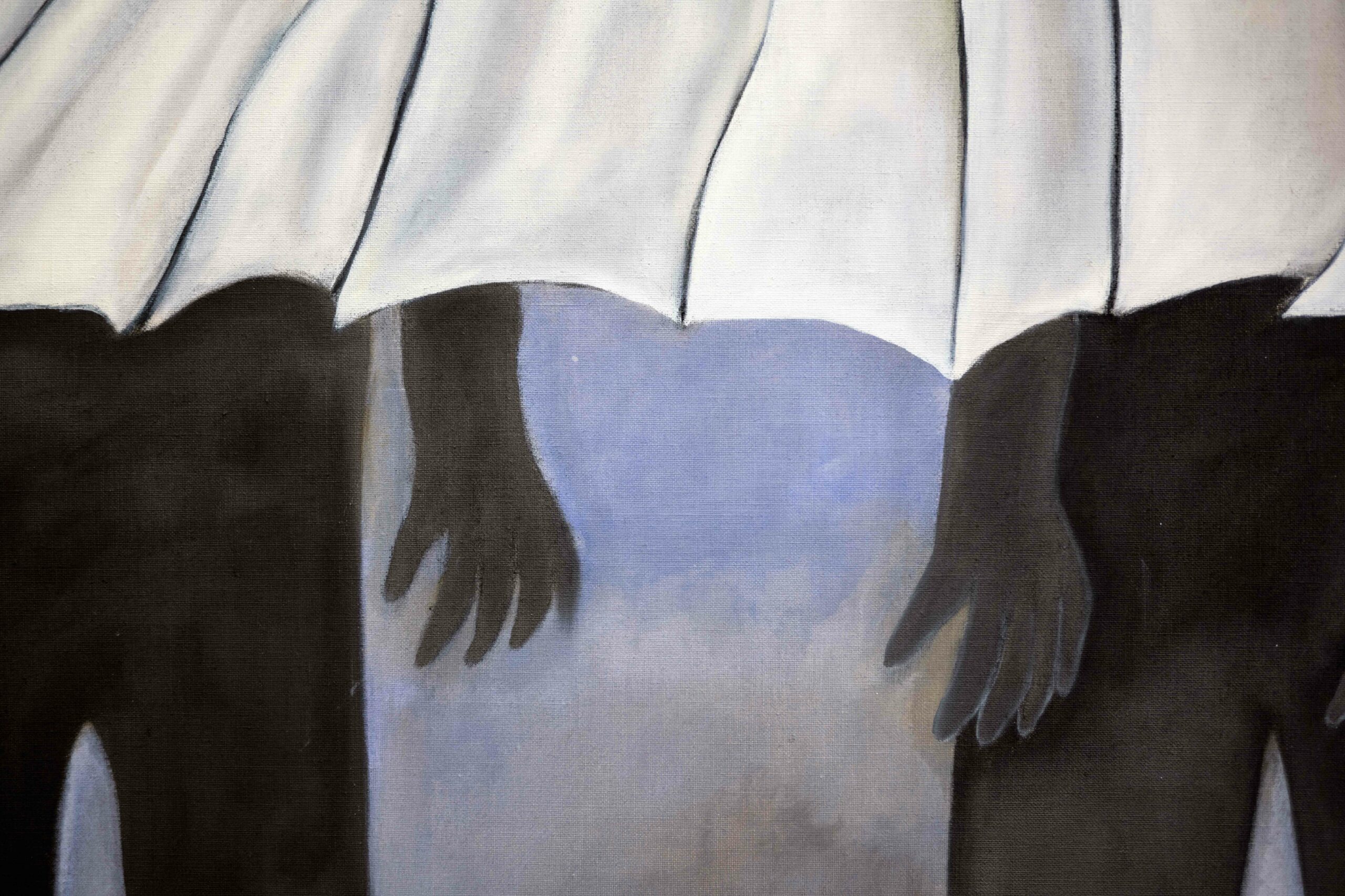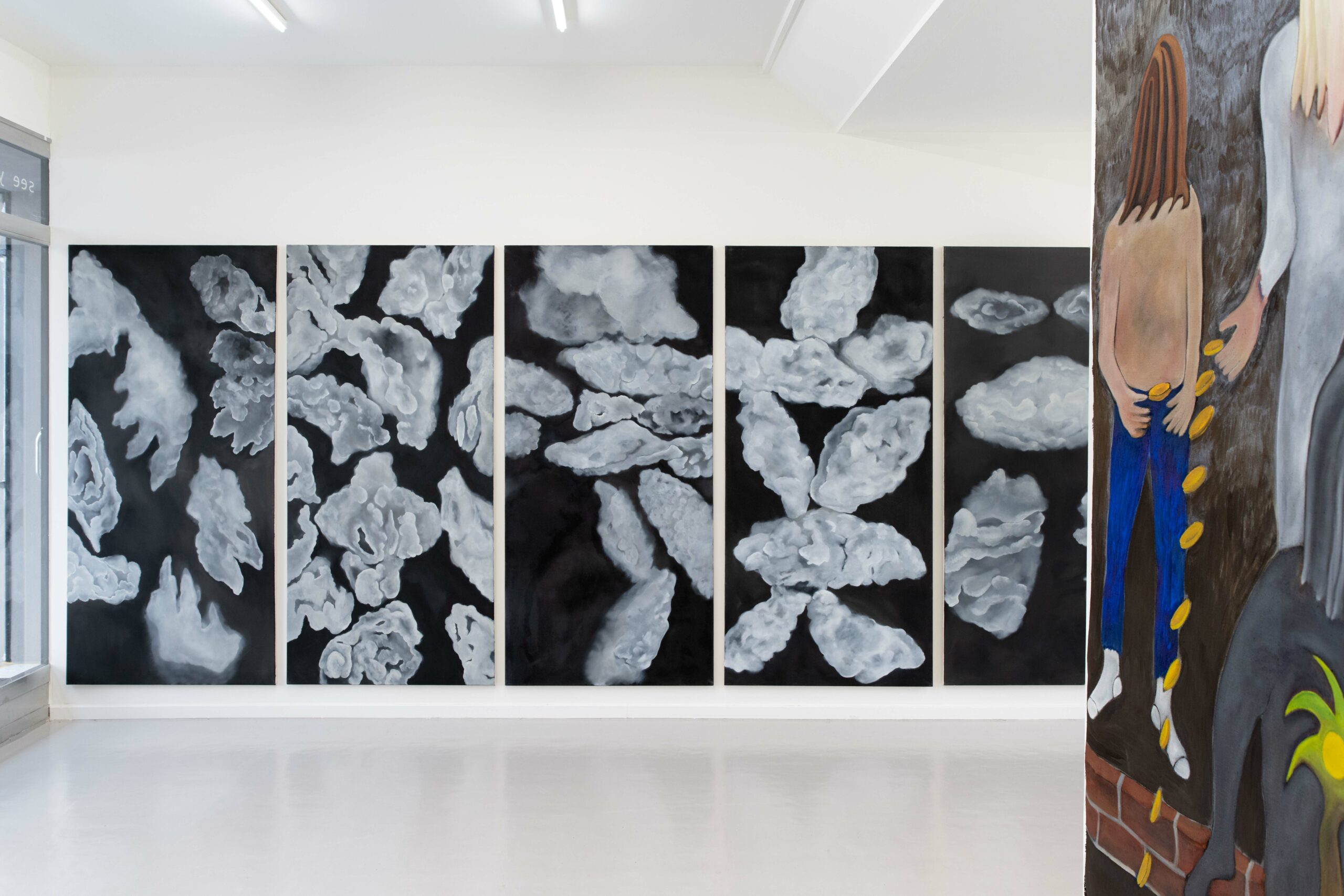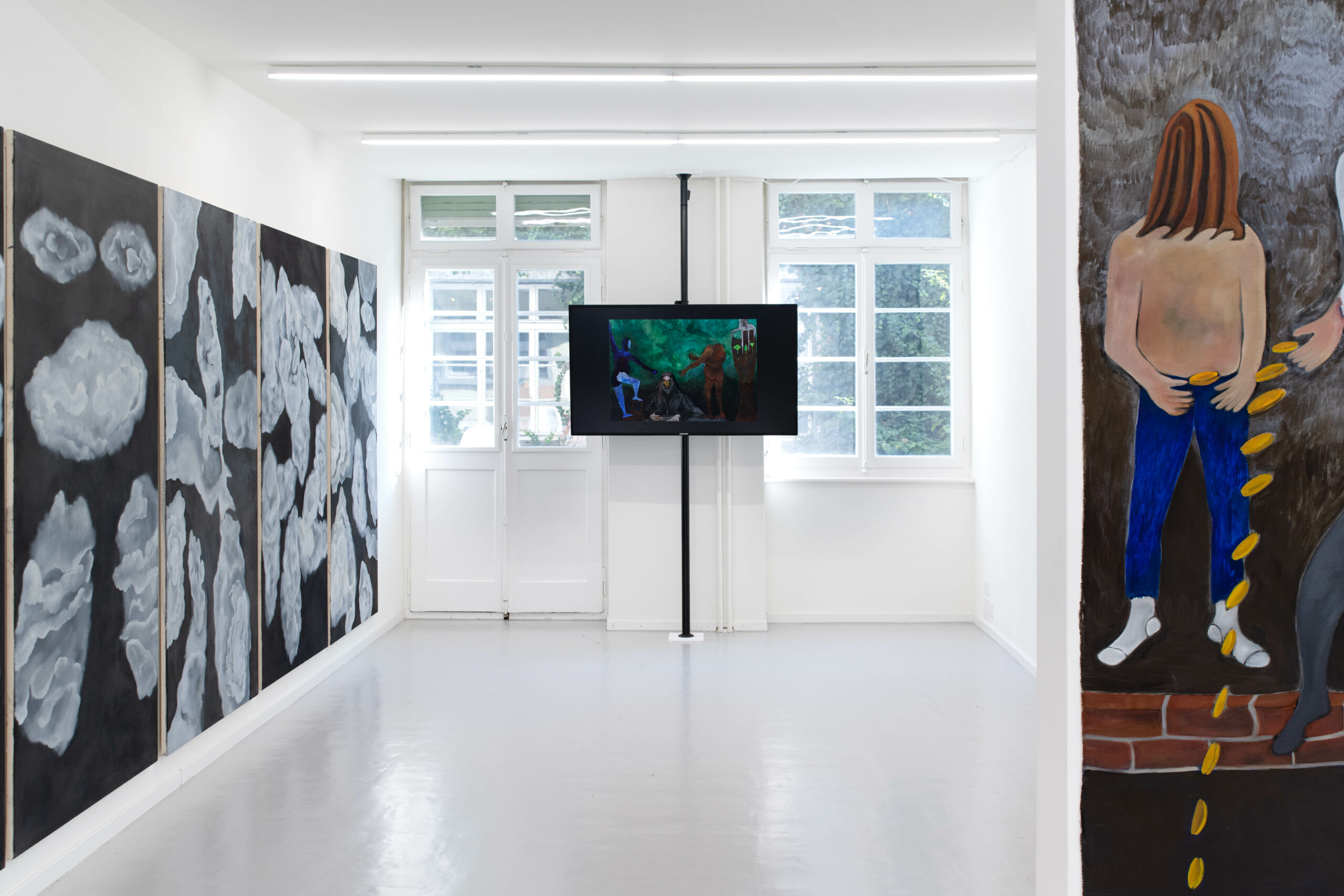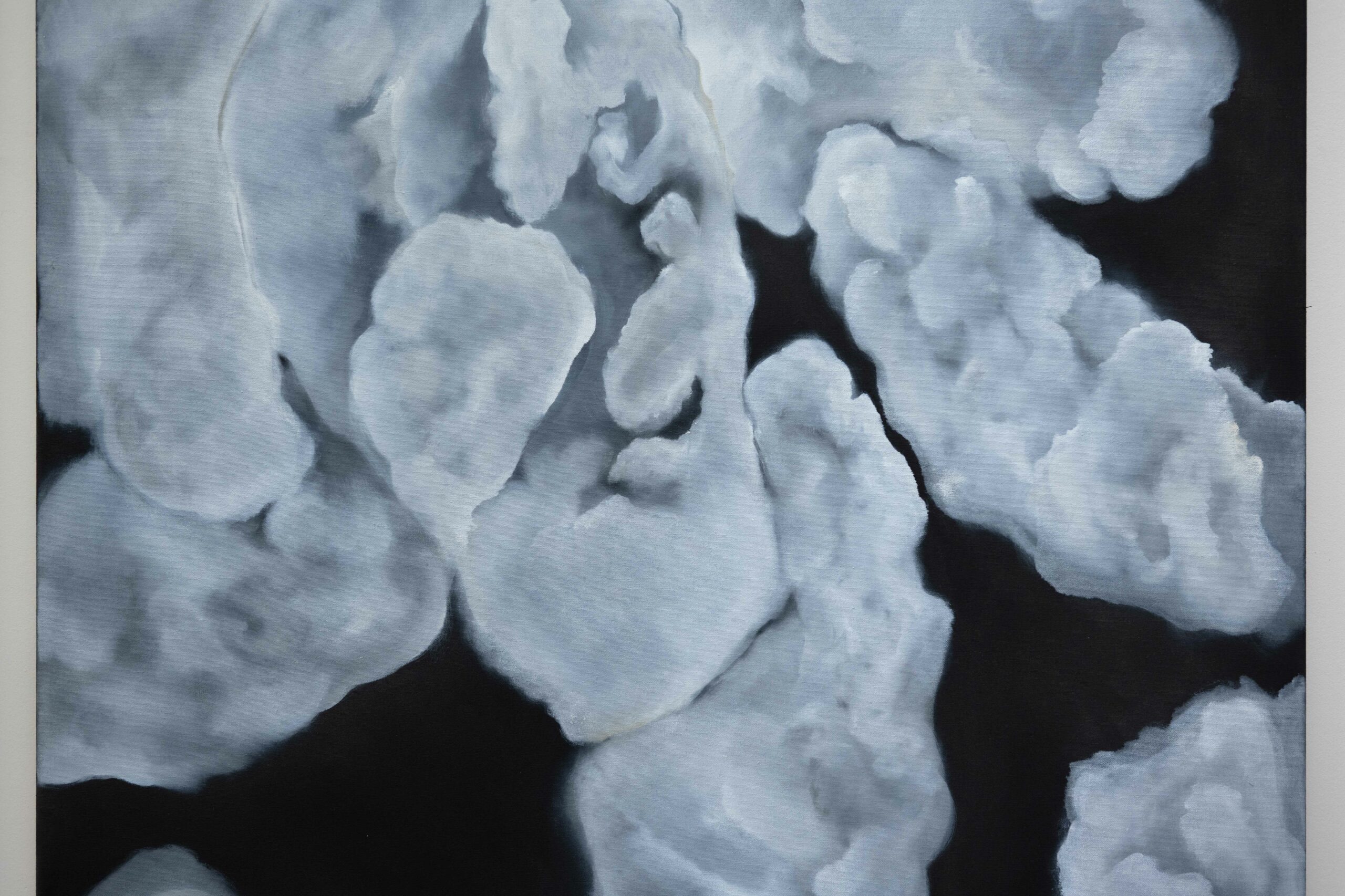“Temple of Men” ist eine mehrteilige Arbeit, bestehend aus Zeichnungen, Malereien und Videos. Hier zeige ich einen kleinen Teil meiner Auseinandersetzung mit Männlichkeit als Idee und Symptom. Bei der Planung der Ausstellung dachte ich immer wieder an das Innere einer Kirche. Vielleicht auch an das Innere eines Mannes, dessen Versteinerungen an den Wolkenbildern sichtbar werden.