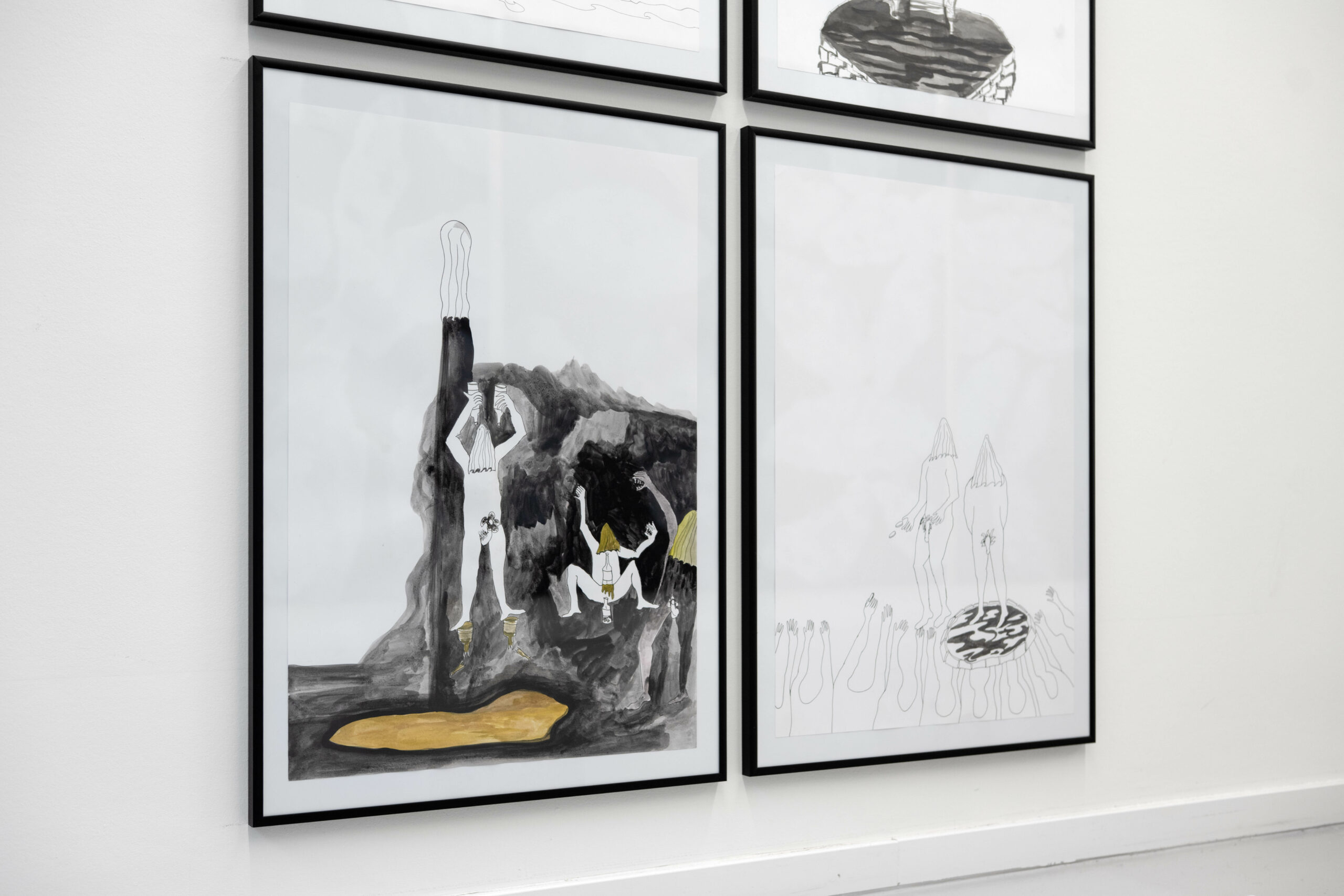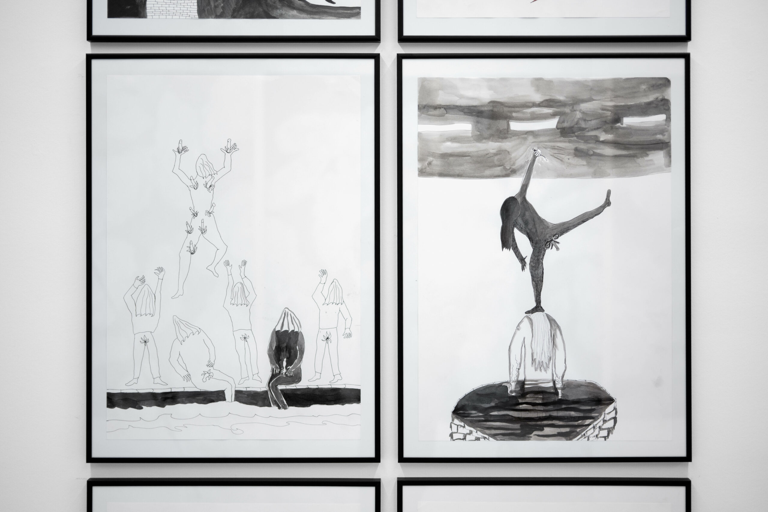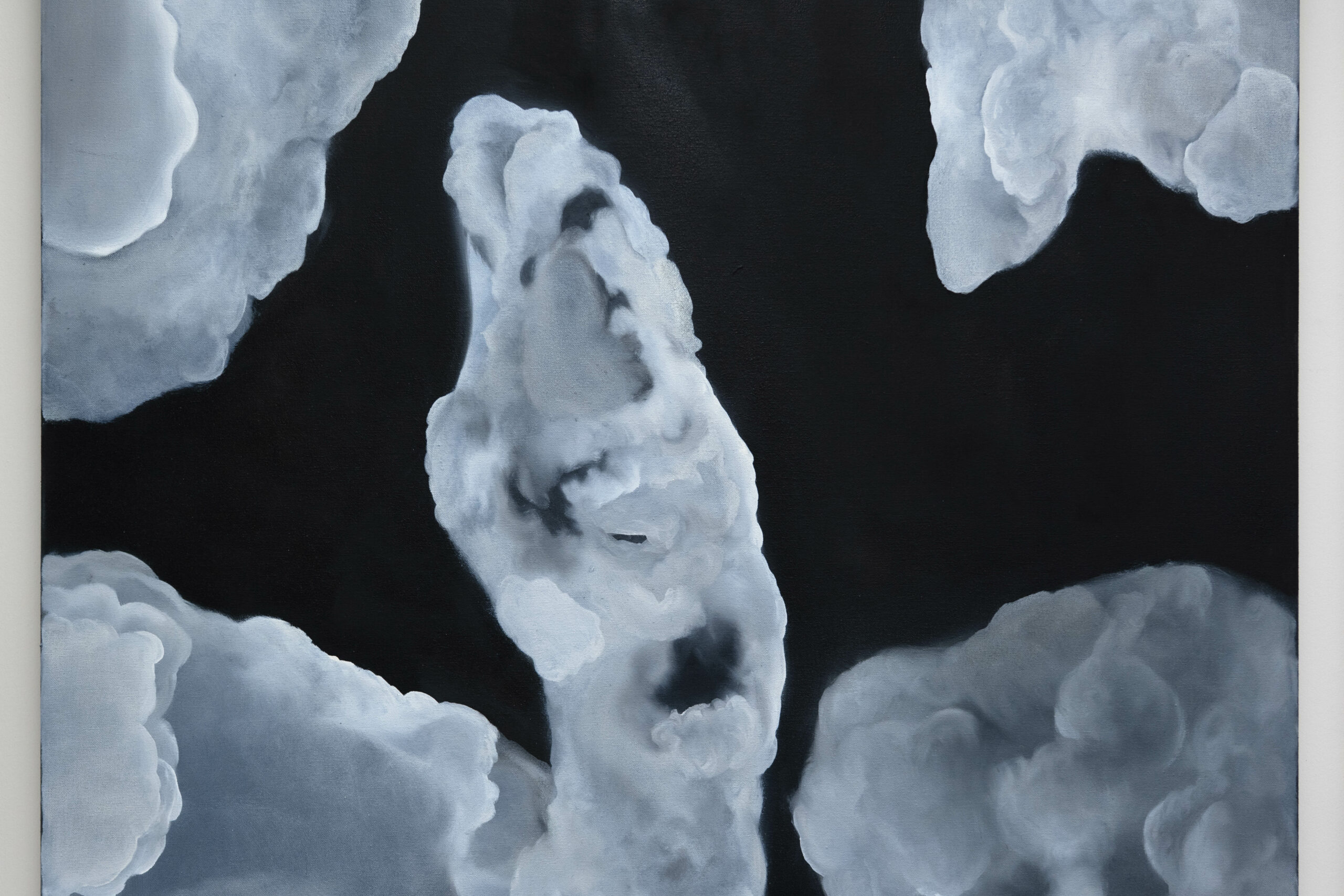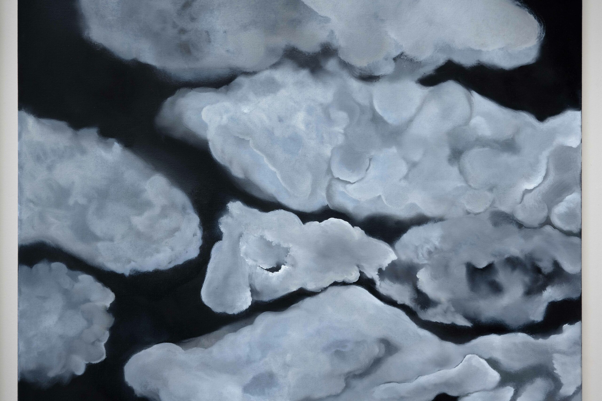 “Temple of Men” is a multi-part work consisting of drawings, paintings, and videos. Here, I present a small segment of my engagement with masculinity as both an idea and a symptom. While planning the exhibition, I repeatedly thought of the interior of a church — perhaps also of the interior of a man, whose petrifications become visible in the cloud formations.
